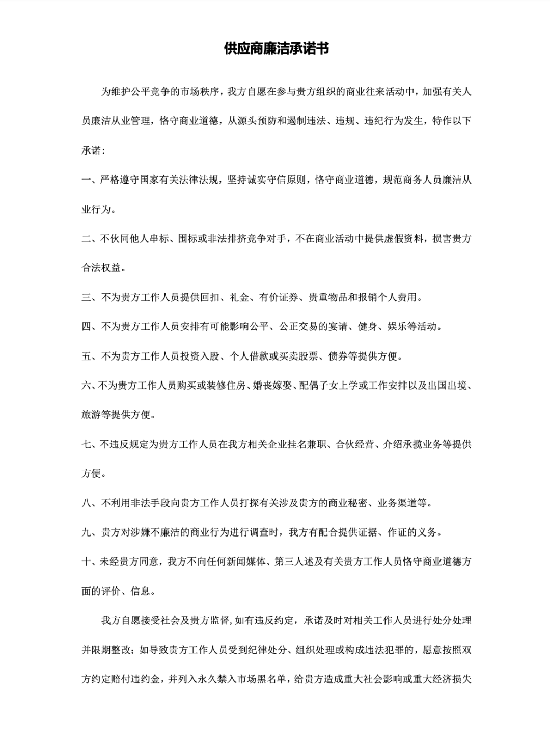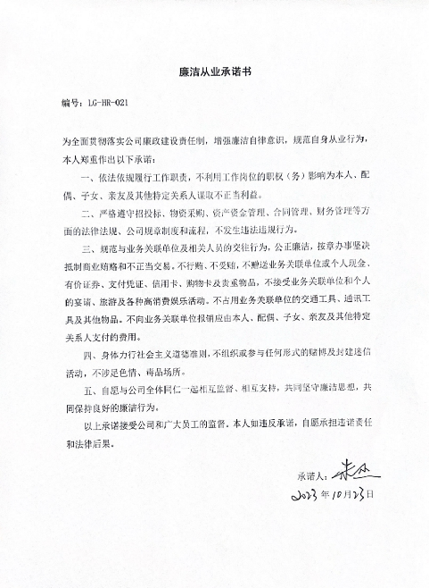 建立健全企業廉潔承諾機制,公司高管和財務、質量、采購、銷售等重點部門人員簽訂廉潔從業承諾書,定期開展述廉活動。