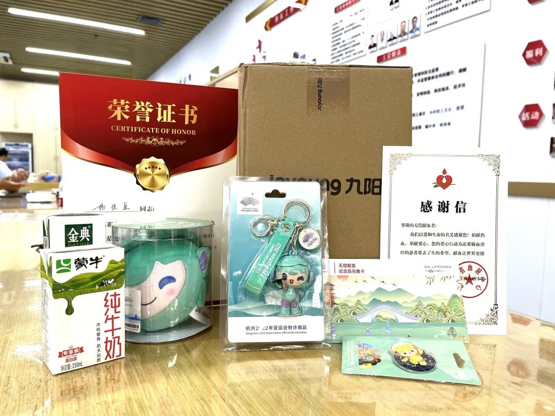 我司黨支部為每一位勇敢的無償獻血者準備了精美的亞運文創紀念品,此外,錢塘區衛健委大力支持本次應急獻血活動,特為獻出愛心的無償獻血者準備了小禮品。