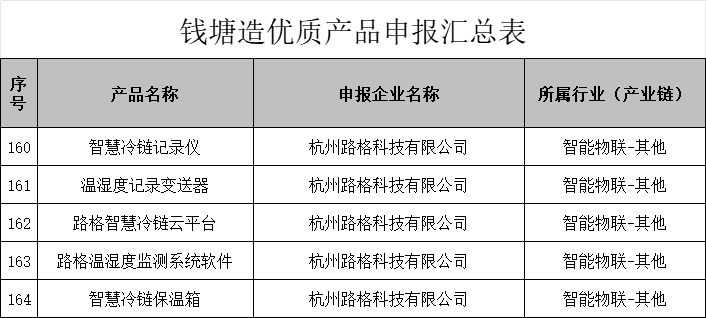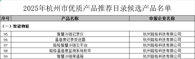 近日,杭州市經濟和信息化局和錢塘區經濟信息化和科學技術局相繼公布了《2025年杭州市優質產品推薦目錄候選產品名單》和《2025年“錢塘造”優質產品推薦目錄候選產品名單》。憑借卓越的產品品質和技術創新實力,我司旗下“智慧冷鏈記錄儀”、”溫濕度記錄變送器”、”路格智慧冷鏈云平臺”、”路格溫濕度監測系統軟件”、”智慧冷鏈保溫箱”等五款核心產品成功入選兩大目錄,標志著我司在智慧冷鏈監測領域的領先地位再獲權威認可!