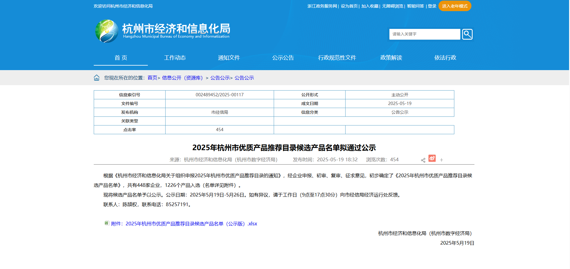 《杭州市優質產品推薦目錄》是杭州市經信局貫徹落實“新制造業計劃”的一項重要舉措,所入圍的產品均通過市政府各級領導及相關部門的層層選拔,在科技創新、產品研發、數字化智能制造以及品牌影響力等方面具有出色成績。