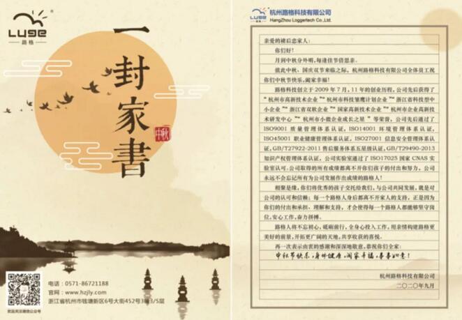 為了彌補部分員工中秋節不能回家與親人團圓的遺憾,公司特意為員工家屬郵寄了一盒月餅和一封家書。家書匯報了公司近一年的發展和取得的成績,表達了路格對各位家屬的感謝,感謝他們在每一位路格人身后的默默支持和奉獻,祝愿大家中秋快樂,身體健康、闔家幸福。