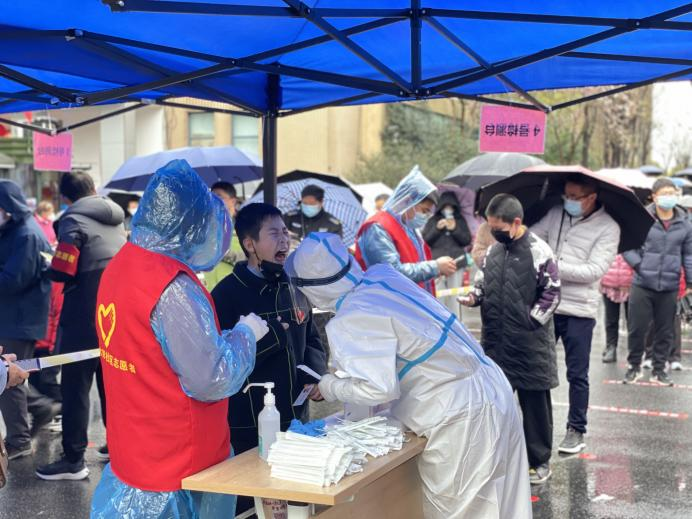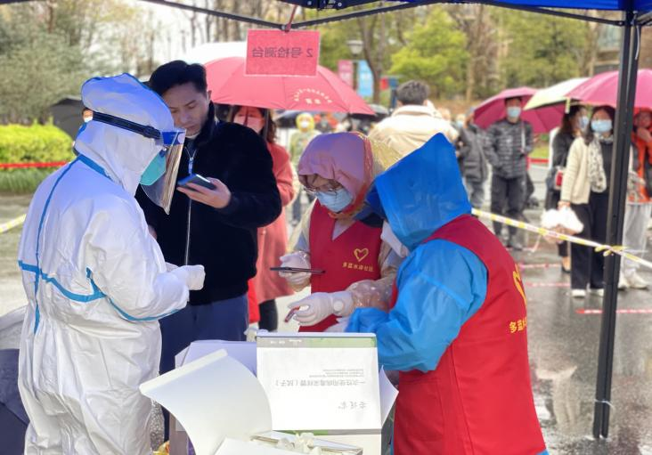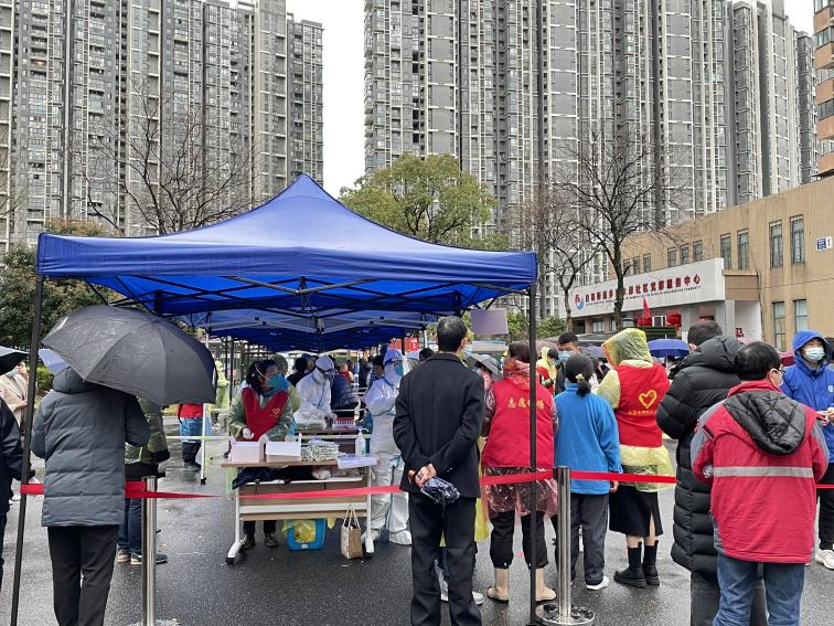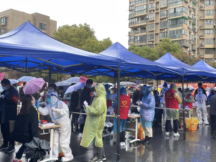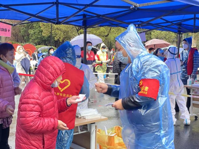 清晨的社區還蒙蒙亮,氣溫由于下雨愈發寒冷,志愿者們到達社區后便馬不停蹄地穿起雨衣和馬甲,立即跟隨工作人員布置場地,搬運物資,協助醫護人員進行掃碼和核酸檢測,維持現場秩序,發放核酸采樣證明等工作。