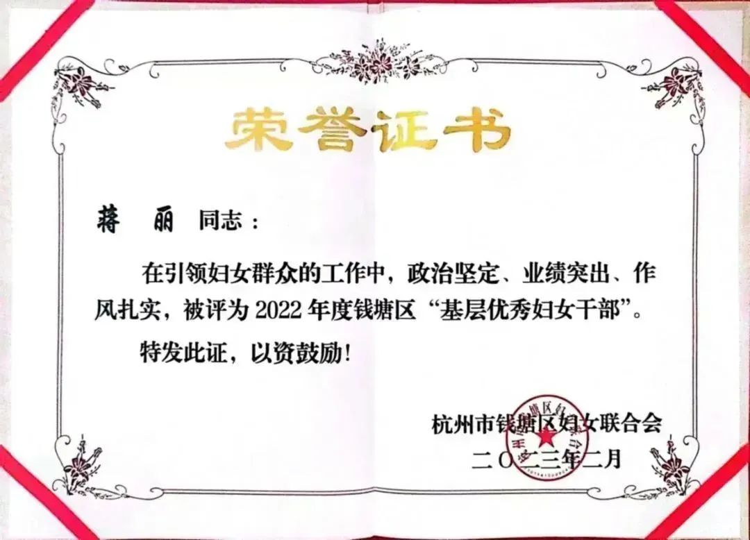 公司婦聯主席蔣麗被評為2022年度錢塘區“基層優秀婦女干部”,在引領婦女群眾的工作中,政治堅定、業績突出、作風扎實。