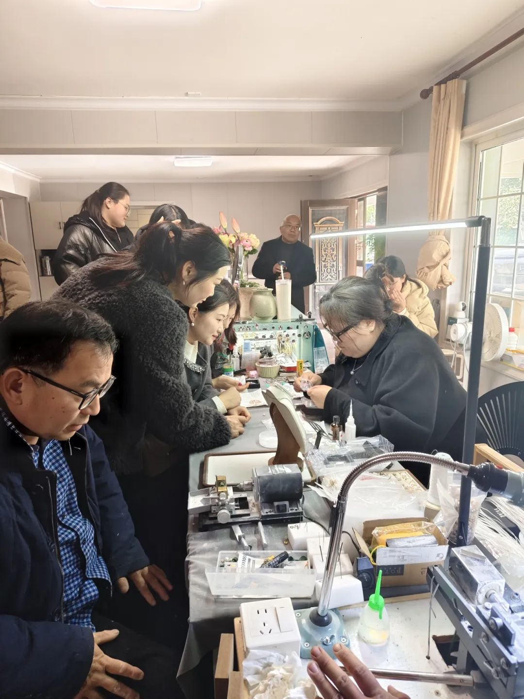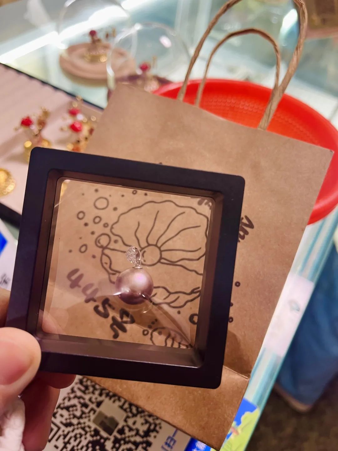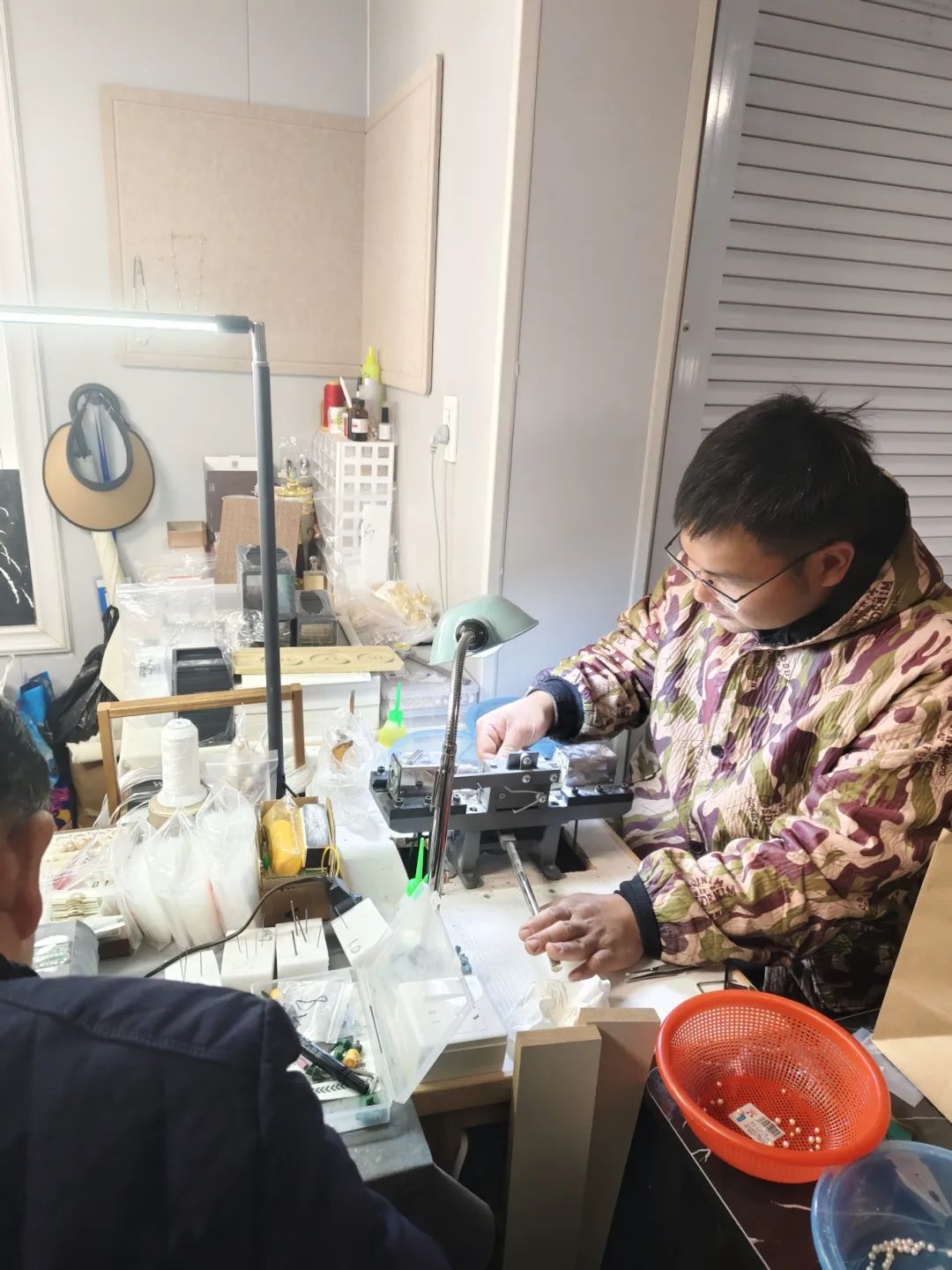 來到了最后的裝配加工環節,在工藝老師的協助下,珍珠經過打孔、鑲嵌、粘合,一顆顆飽滿溫潤的珍珠變成了一個個獨一無二的珍珠飾品。大家互相觀摩成品,彼此夸贊,現場一片歡聲笑語。