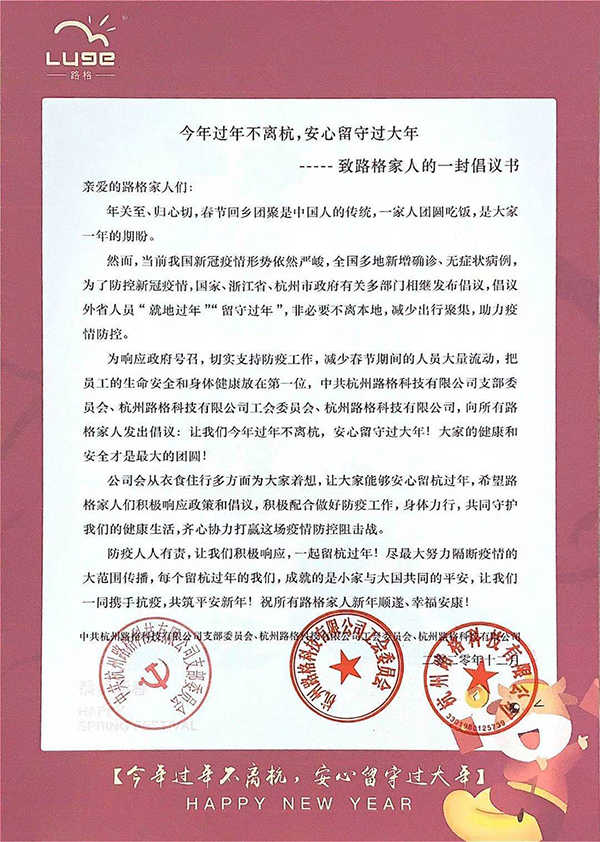 再次感謝每位路格家人的支持與理解,體諒與付出。相聚并不遙遠,最重要的是當下的安全和健康,希望大家都能夠安心留杭過年,在年節后全身心投入到工作中去,不給國家添亂,身體力行,做有擔當的路格人。待到春暖花開日,相聚言歡味更長。疫情無情人有愛,希望公司的心意能為同事們帶去溫暖和關愛,讓全體員工帶著公司的新年祝福,懷著喜悅的心情,共度美好的新春佳節,衷心的祝愿全體路格家人新的一年幸福安康!祝福路格所有新老客戶、合作伙伴、全體路格人及家屬闔家歡樂、新年大吉,萬事如意!