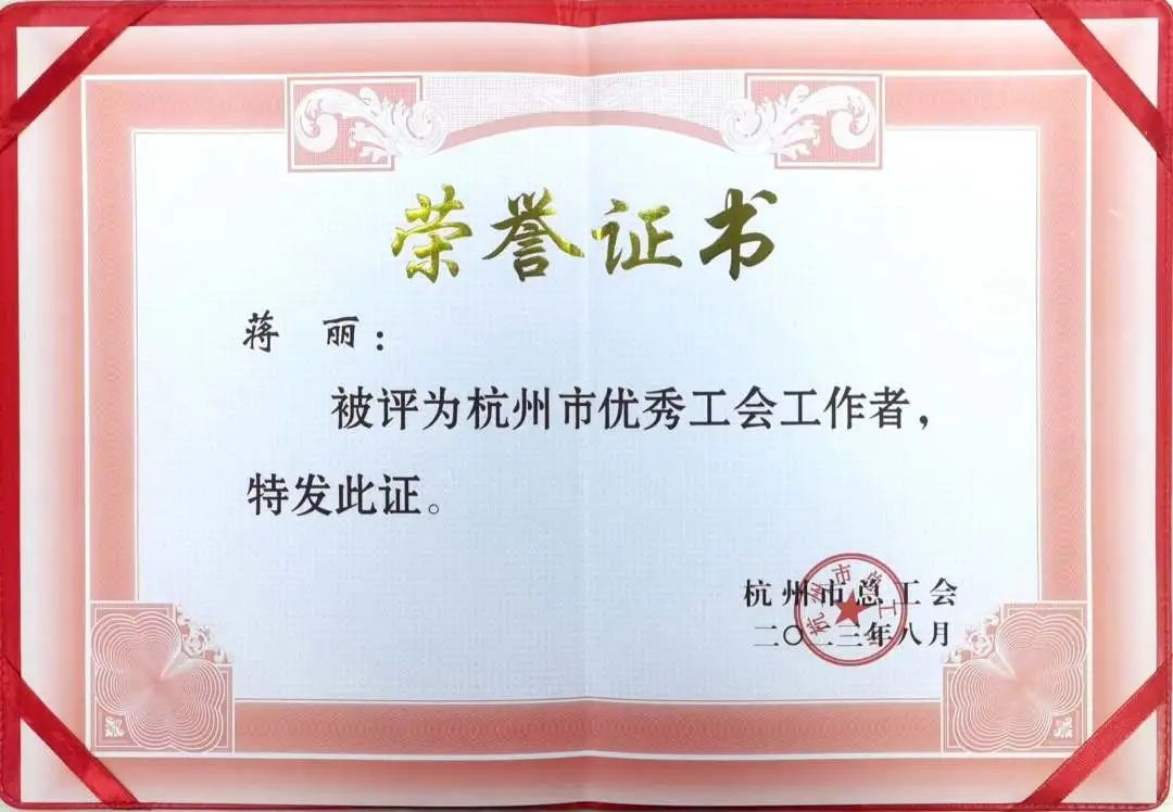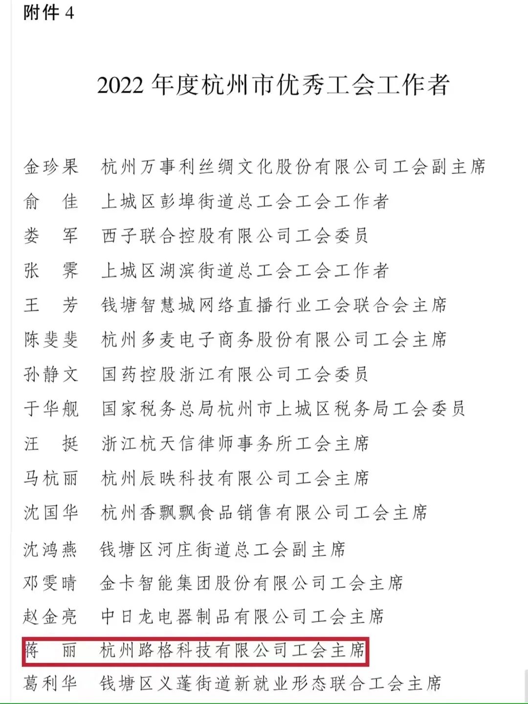 杭州路格科技有限公司工會主席蔣麗被評為“2022年度杭州市優(yōu)秀工會工作者”。