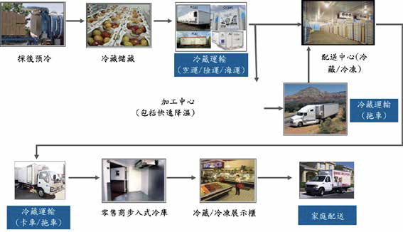 果蔬冷鏈與我們的生活息息相關,一條優良的冷鏈始于高品質的產品。對于果蔬來說,其產品必須經過恰當的采收,及時從農田送出并進行預冷。采收后的農產品通常是貯存在冷藏庫中,直到它們被運輸至下一個地點。在運輸途中可以將農產品在不同地點(包括冷藏配送中心)卸下,然后和其它產品一起送往商家,如零售商店、餐飲店或批發市場等,直至被消費者購買。在上述的整個流程中,每個步驟都是非常重要的,尤其是從一個環節到下一個環節銜接時的控制處理對于最后能否為消費者提供高品質的產品起到了至關重要的影響。(圖1)